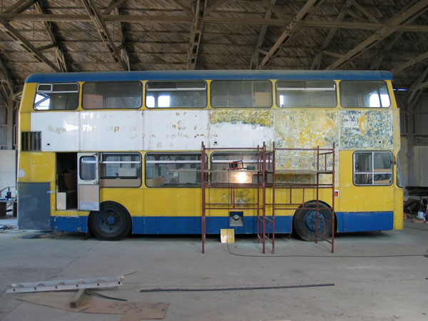 The bus in the WWI hanger getting ready to be painted, it's a lot of work getting all the old paint off, although i'm mostly involved in other ways.