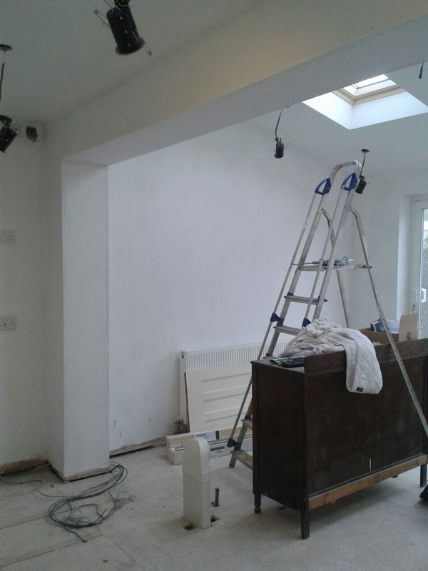 The walls are white, most of the work for the builders is now complete, timber for the floor and the worktops arrives on Friday. Almost over to me.