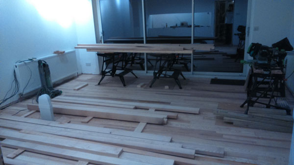 The floor is down and beautiful. The timber arrived (all 600Kg of it) and sat in the room for just shy of two weeks before being fitted. I hope it was long enough to aclimatise properly. I'm gluing up the worktops (these are made of the same Ash that the floor is) it's quite hard work. The new room makes a fantastic workshop. No glass yet between the kitchen and study. This is concerning me. Kitchen arrives on Wednesday.