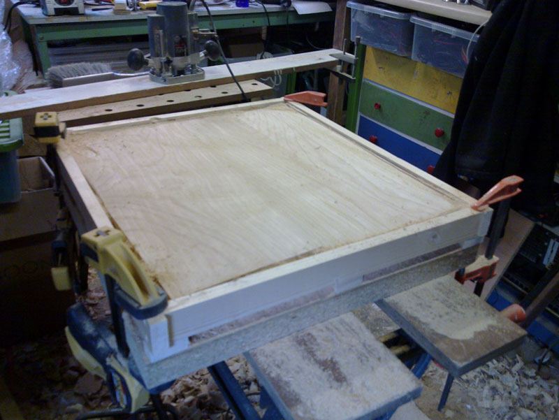 I'd decided to maximise the grain patterns (and avoiding some shakes and splits) which meant joining the outside of one piece to the inside of the other. I don't know if this is a bad idea but i guess i'll find out. Before i start routing the shape i need to make sure one of the surfaces is flat. For arbitrary reasons i decide to make the back flat. So i make a frame which is nice and square on a flat piece of board and my (little) router is mounted on another board which is then used to create a flat surface.