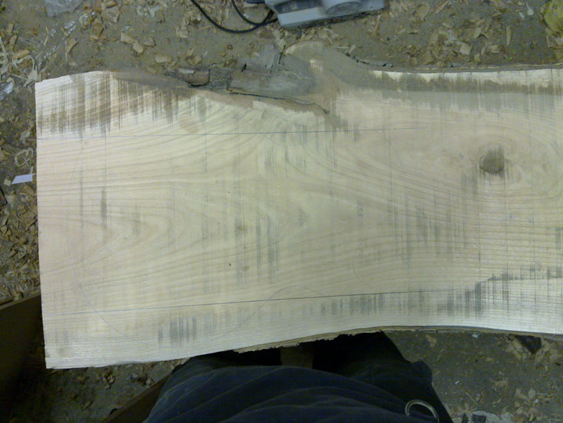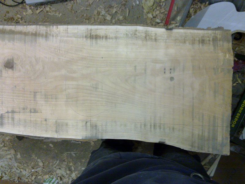 Unconventionally i'm going to make this guitar out of Cherry. I don't really know what it will sound like but it's generally like Maple so i'd guess it should be quite bright. The Cherry was bought as a 2inch slab of wood, kiln dried and ragged edged. I have since stored it for a year and realised that it's not quite big enough to get a whole guitar out of the width. Anyway have some pictures of the bare wood.