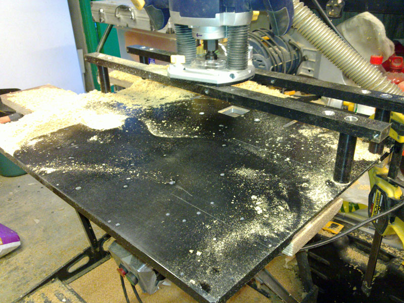 The router table i made to hold my 1/2inch plunge router. The router can be mounted underneath the table or on rails above the table. I can also use the rails and move the router along them, uses a guide bush to prevent me hitting said rails (ooch - Tungsten Carbide cutter running at 30,000rpm into steel hmmm). The base is a piece of 12mm aluminium tool plat salvaged out of a decommisioned scientific instrument. My extract system (yes it's a dyson) is shown in the background of the above and connected to the router using the router's extract mounting. When the router is mounted underneath the table i mount the extract near the cutter.